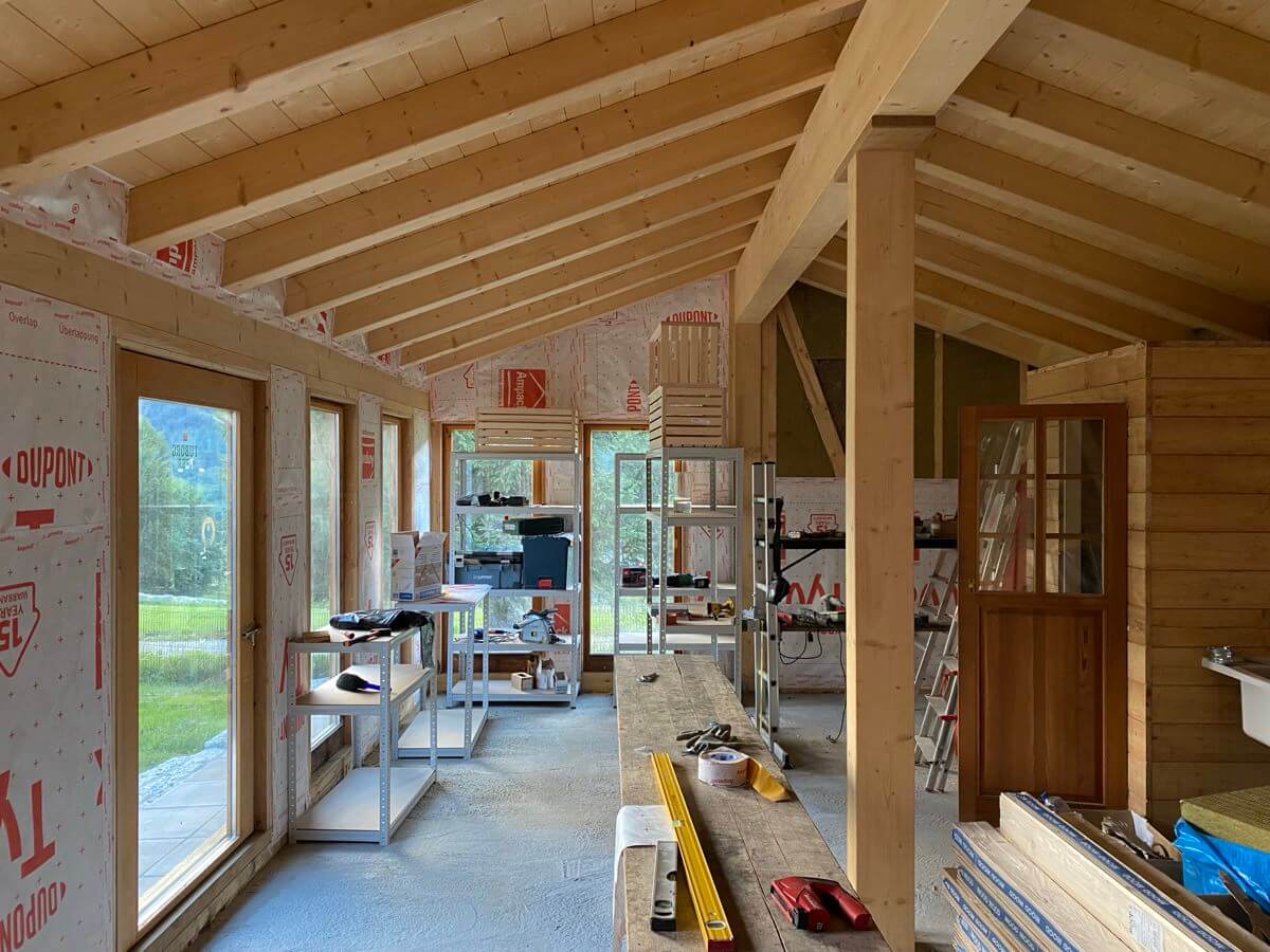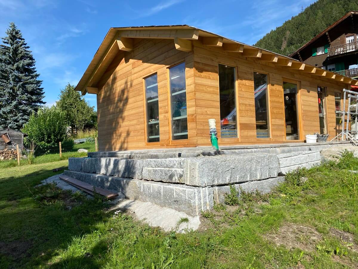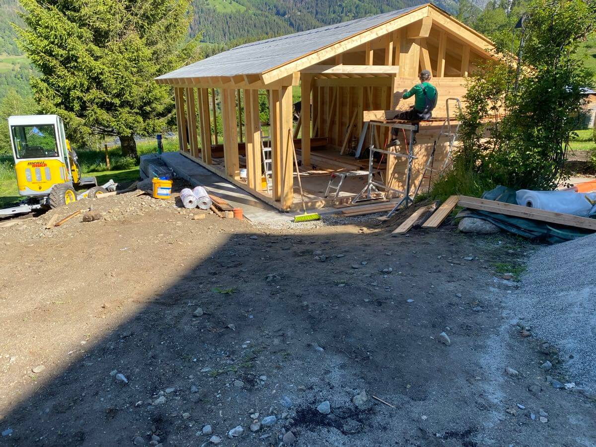 Errichtung eines modernen Gartenhauses, perfekt angepasst an die alpine Umgebung.